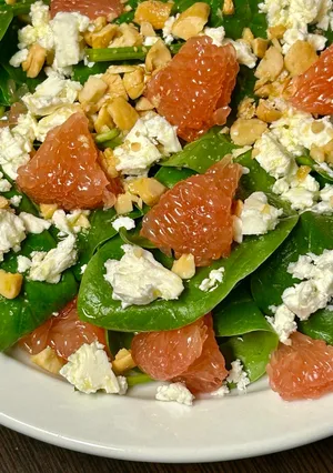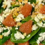 Cuci bayam, keringkan, lalu letakkan di atas piring.Letakkan potongan kulit jeruk bali yang sudah dikupas dan lelehkan di atasnya.Rozkrishiti feta.Tambahkan pecan kering ke dalam salad, tuangkan saus, campur dengan garam,