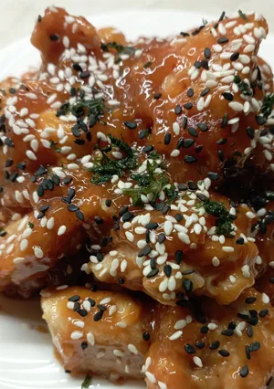 Potong ayam menjadi potongan sedang, tambahkan 2 sdm tepung kanji dan bumbu, aduk rata.Olesi daging dengan 1 sdm minyak hingga berwarna cokelat keemasan, angkat dari wajan.Untuk saus, tambahkan 1 sdm